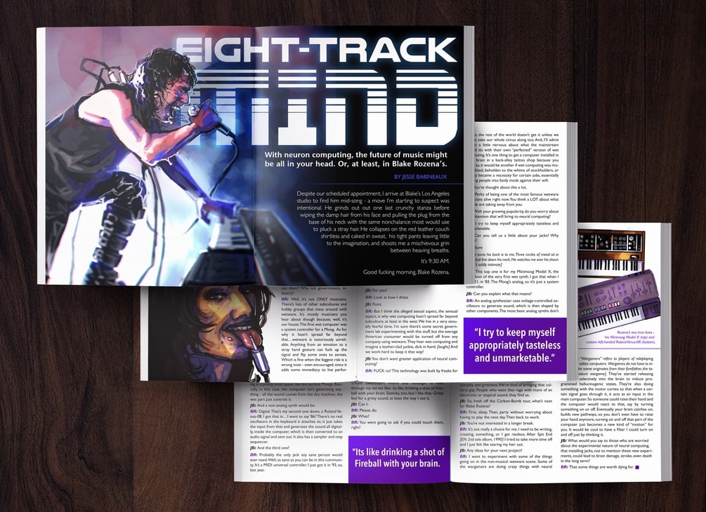 A 1994 music magazine from an alternate timeline where the microchip was never invented, replaced by neuron computers pioneered for electronic music.
